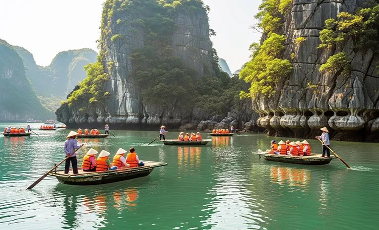 • Explore Natural Wonders: Delve into Sung Sot (Surprise) Cave, one of the bay's largest and most magnificent grottoes, featuring a breathtaking "opera house" of stalactites. Continue to Titop Island, where you can hike to the summit for a stunning 360-degree panoramic view or relax for a swim on its crescent-shaped beach.