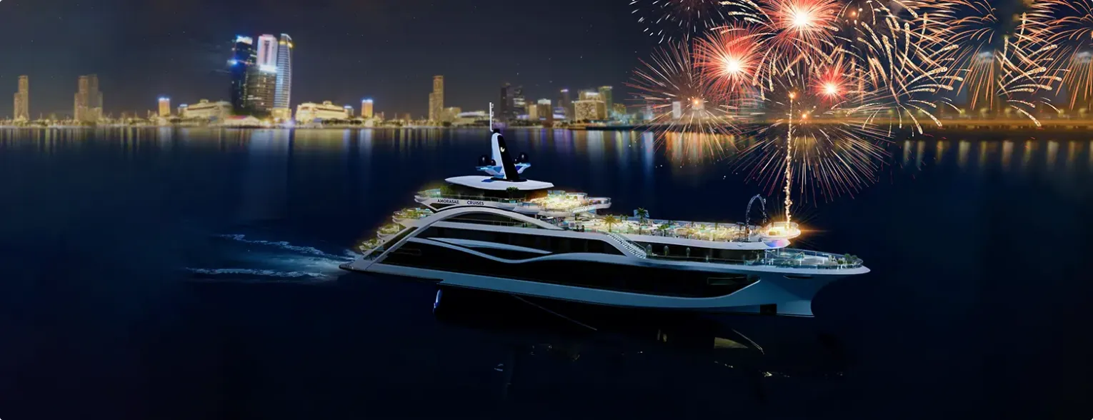 Experience the Amorasae, a 600-guest superyacht uniquely designed for day voyages, blending the bay's natural beauty with a gastronomic journey, vibrant entertainment, and our attentive hospitality.