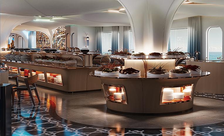 Savor a gourmet international buffet lunch accompanied by live music for a refined and elegant dining experience.
