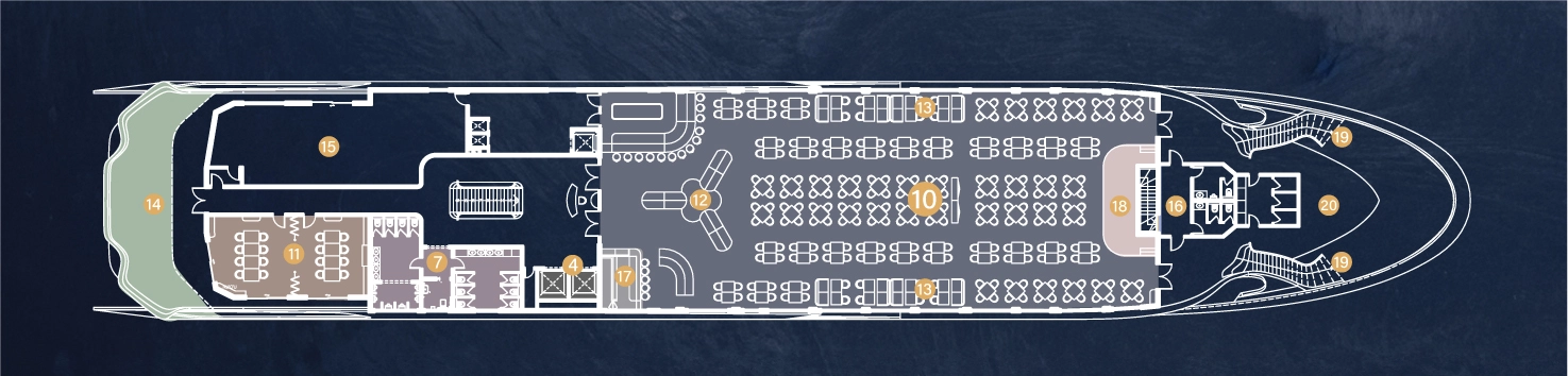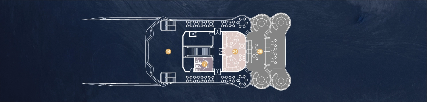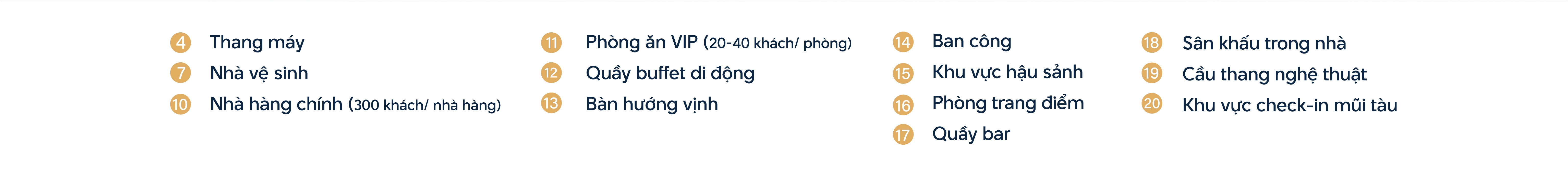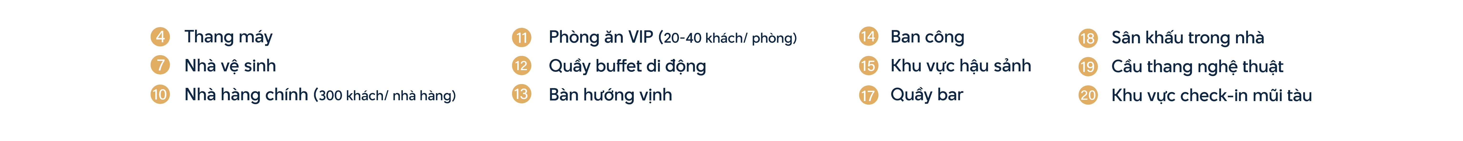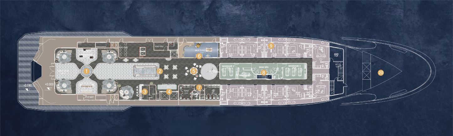 Amorasae Cruise được thiết kế như một kiệt tác nổi trên vịnh Hạ Long với 4 tầng tiện ích và skydeck khoáng đạt. Từ nhà hàng buffet sang trọng, Skydeck Lounge trên tầng thượng và sân khấu ngoài trời, mỗi không gian đều được tối ưu để tổ chức sự kiện, tiệc tối hay hành trình thưởng ngoạn, mang lại trải nghiệm xứng tầm chuẩn mực quốc tế.